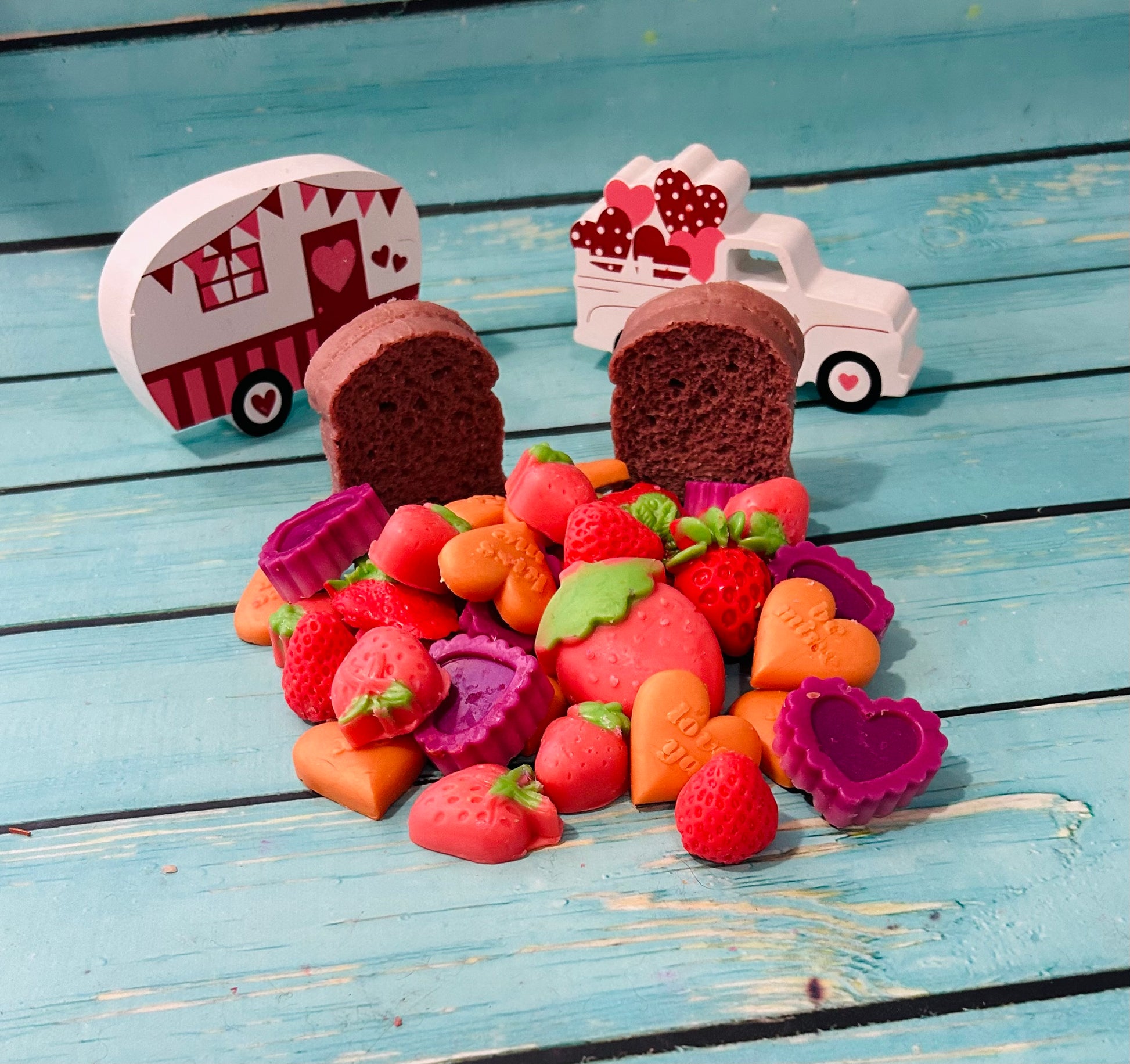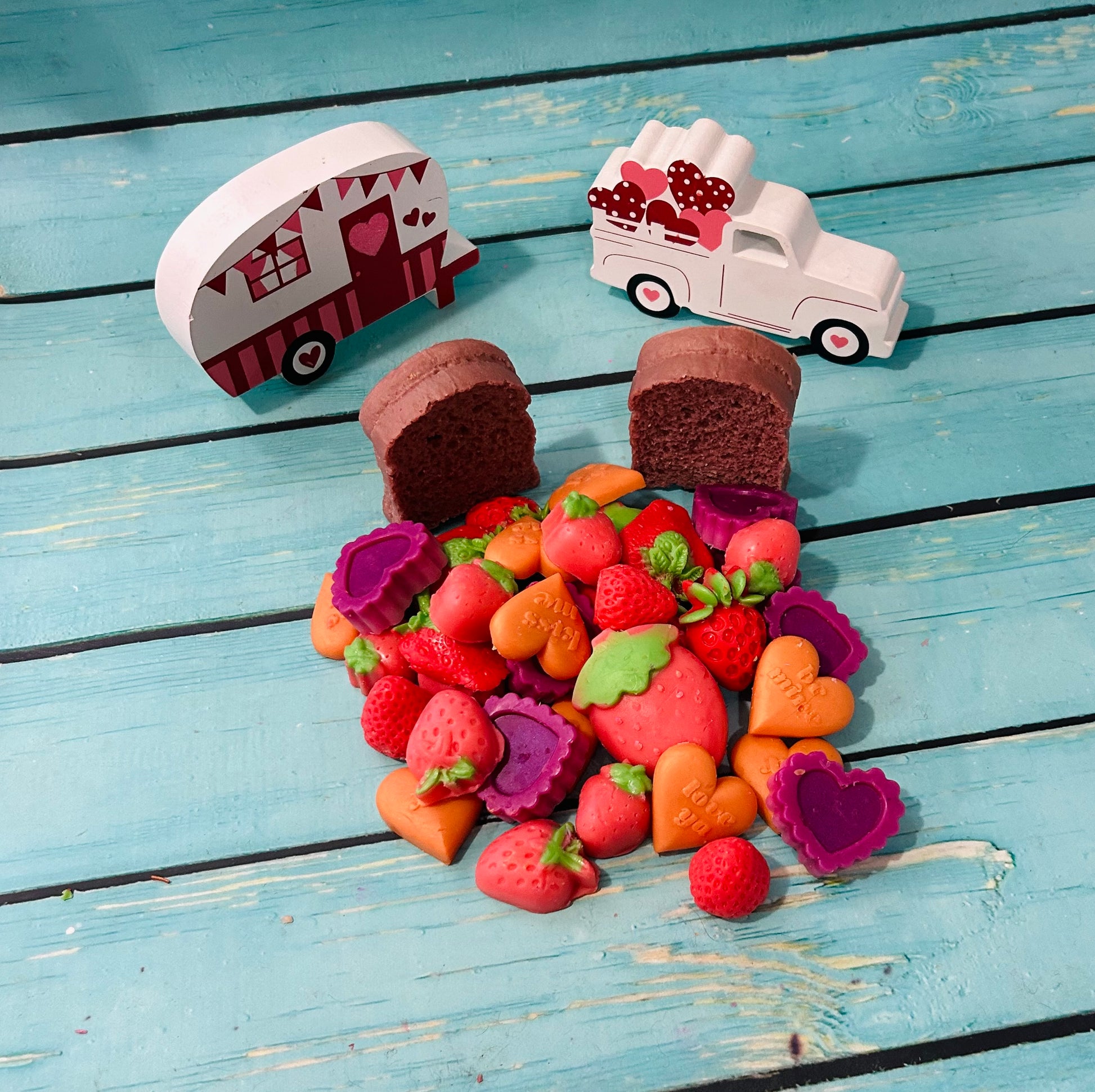 This listing is for various Valentine's Day shape made with IGI 6006 parasoy wax and is 4 ounces each. They are scented in BREAKFAST IN PARIS: STRAWBERRYJAM/FRENCH BAGUETTE/PINK SUGAR. They weigh approximately 4 ounces each. There are 6 available.