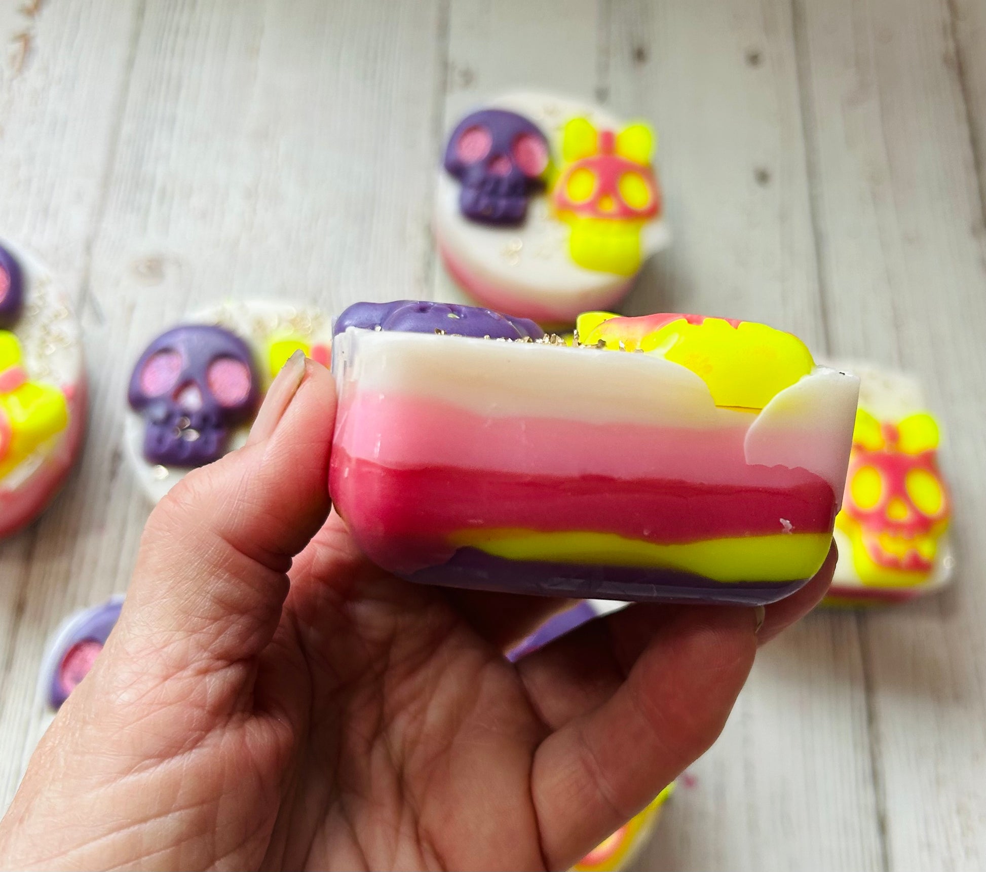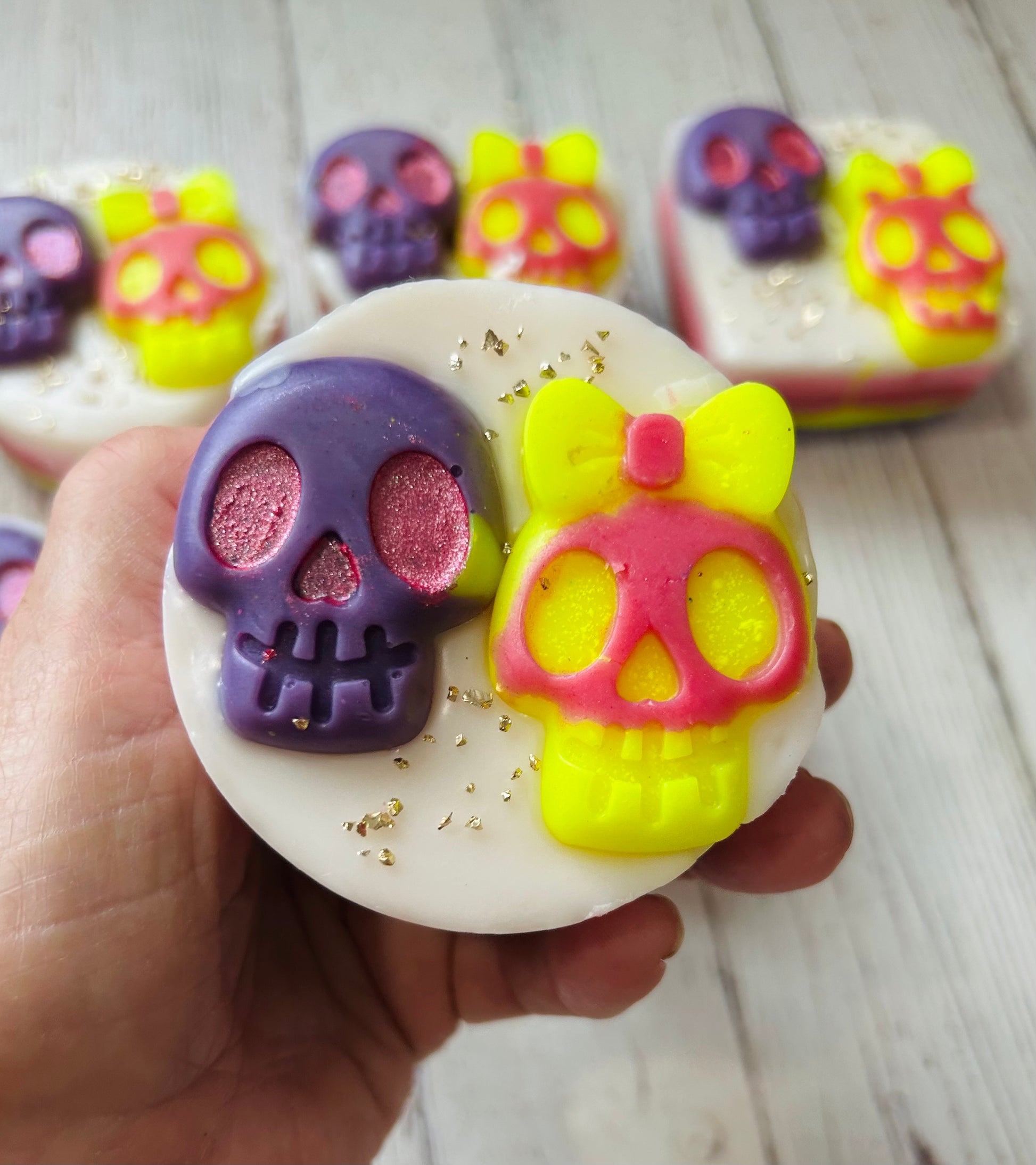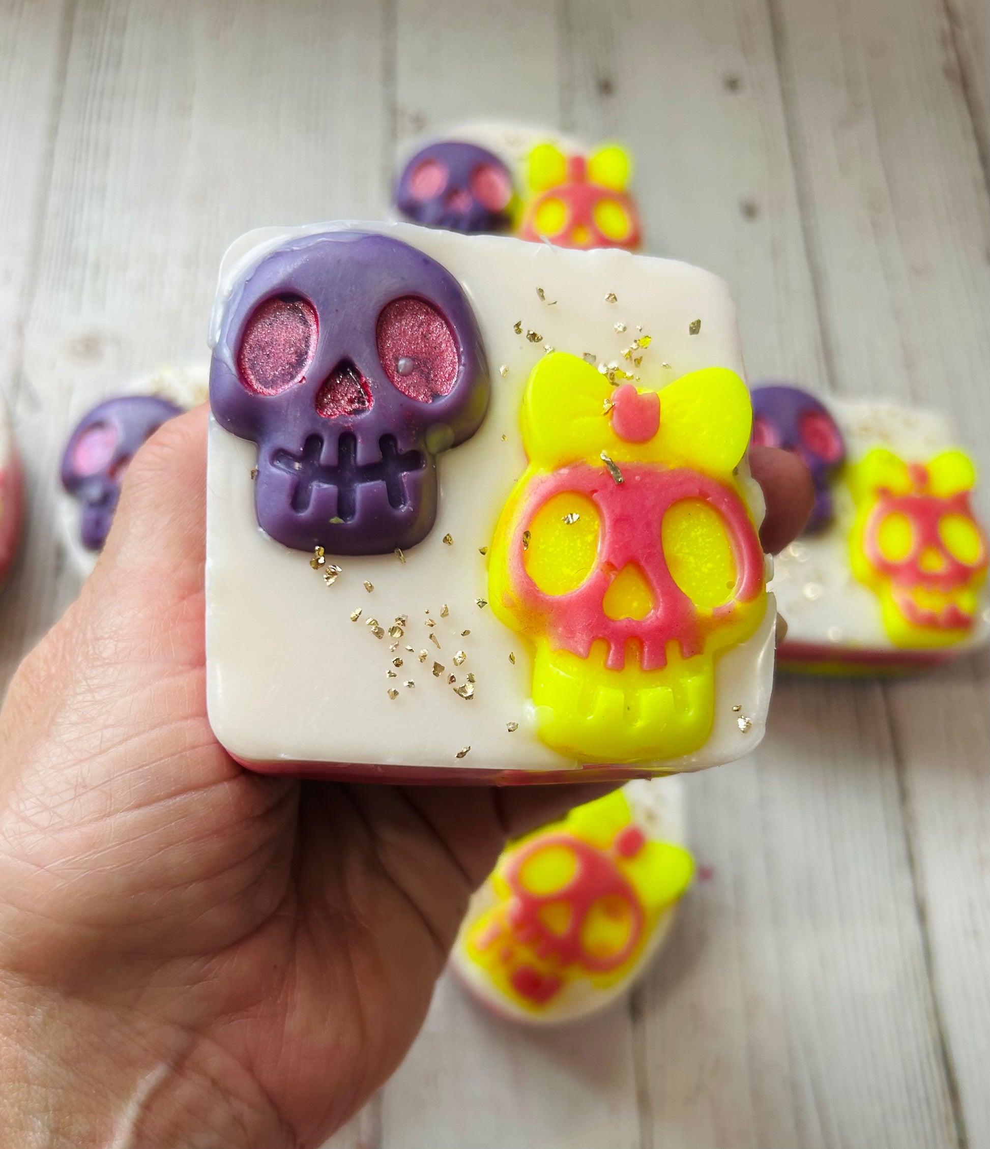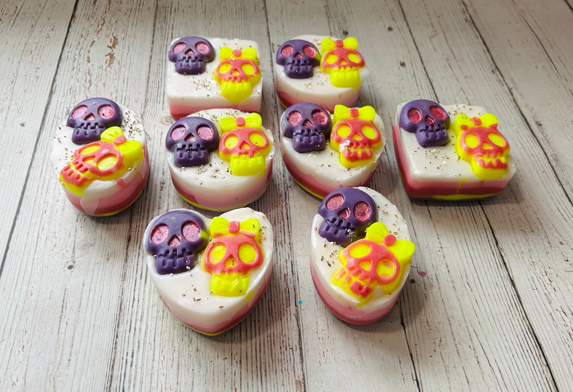 This listing is for a square/heart/round/octagonal shapes with cute skull wax embeds made with IGI 6006 parasoy wax and is 4.2 ounces each. They are scented in BERRY THANKFUL: HONEY CORNBREAD/LOVE BERRY CRUNCH/SWEET & CREAMY. There are 8 available.