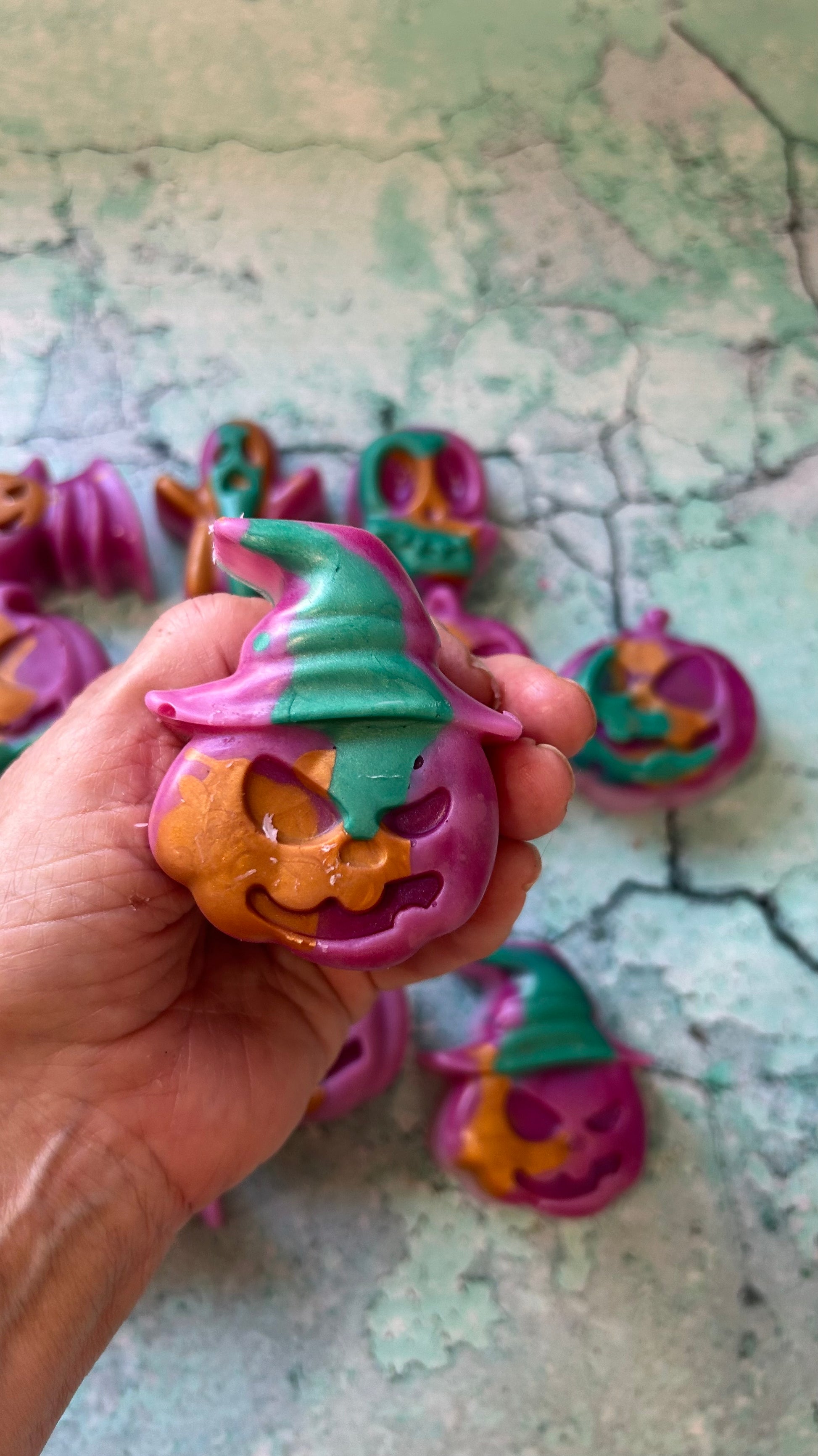 This listing is fora jack-o-lantern shape made with IGI 6006 parasoy wax and is approximately 3 ounces each. They are scented in GOLDEN TRIANGLES: CANDY CORN/VANILLA CAKE POPS/SALTED CARAMEL. There are 12 available.